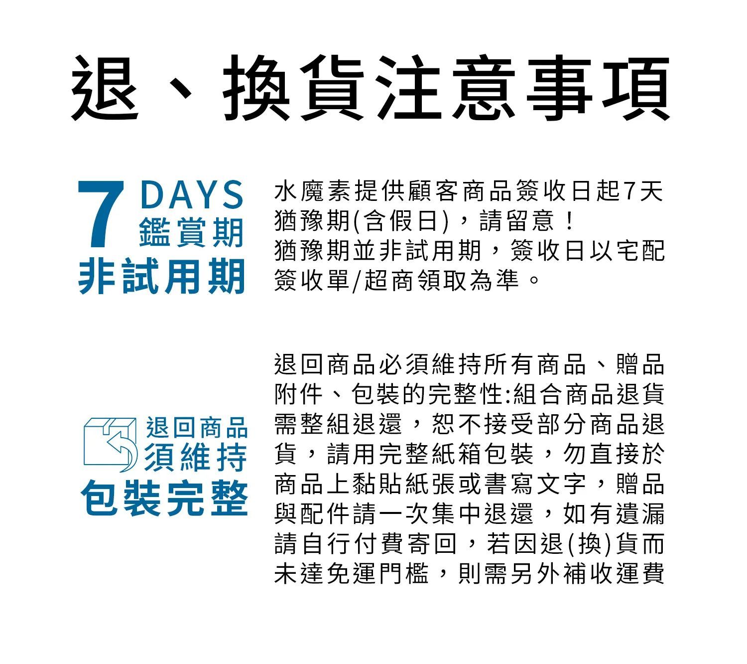 水魔素提供顧客商品簽收日起7天猶豫期(含假日),請留意!